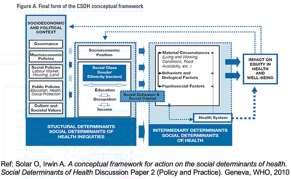 Health and health equity are determined by the conditions in which people are born, grow, live, work, play and age, as well as biological determinants. Structural determinants (political, legal, and economic) with social norms and institutional processes shape the distribution of power and resources determined by the conditions in which people are born, grow, live, work, play and age.