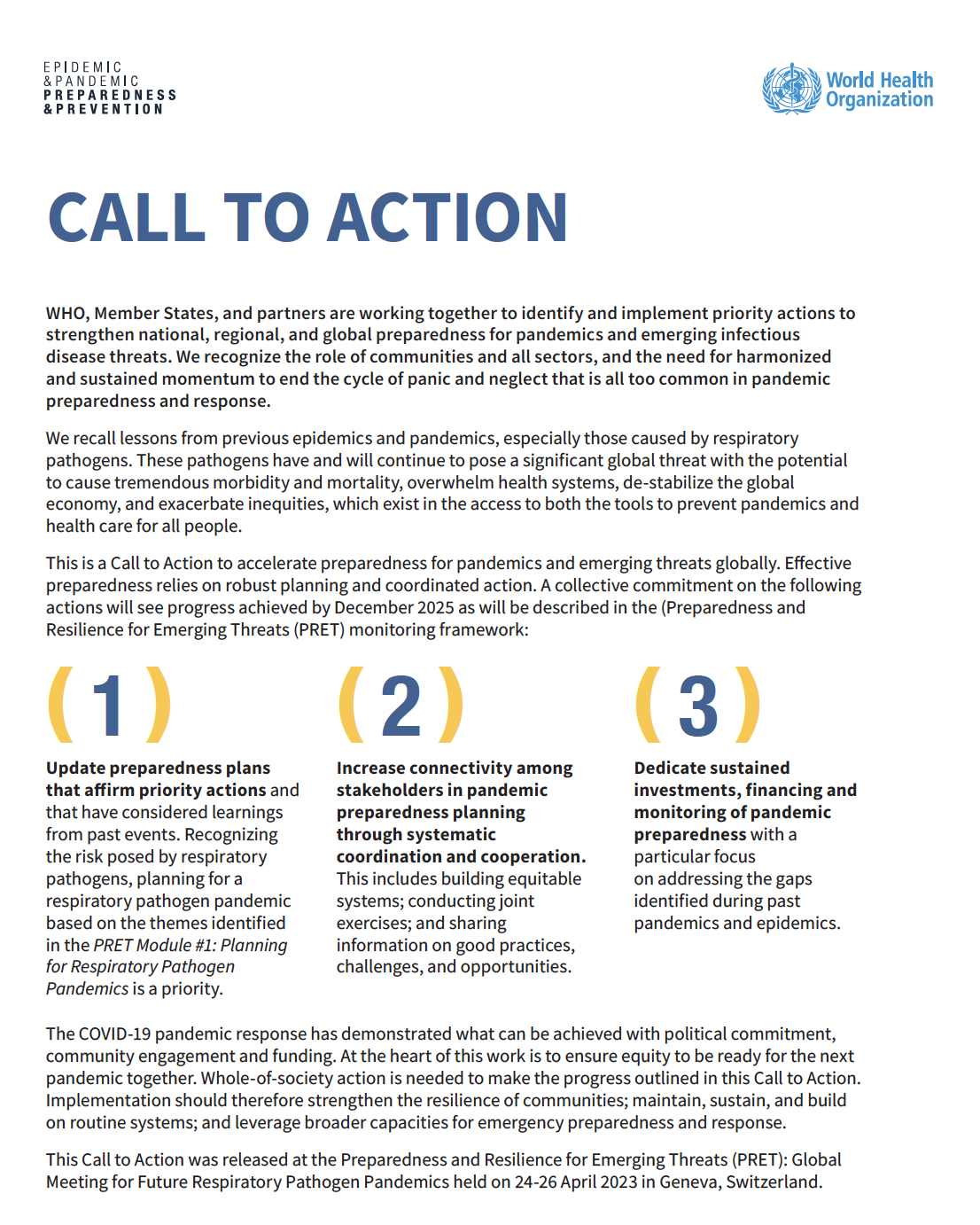 The Global Meeting for Future Respiratory Pathogen Pandemics attended by over 120 multisector, multilevel stakeholders on 24-26 April 2023 in Geneva, Switzerland delivered a high-level Call to Action on PRET.