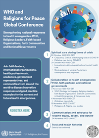 The sessions of the conference will feature innovative responses in the areas of (i) Spiritual care during times of crisis, (ii) Country collaboration between WHO, faith partners and national governments, (iii) Trust and health histories, and (iv) Communication and advocacy for vaccine equity, access, and uptake.